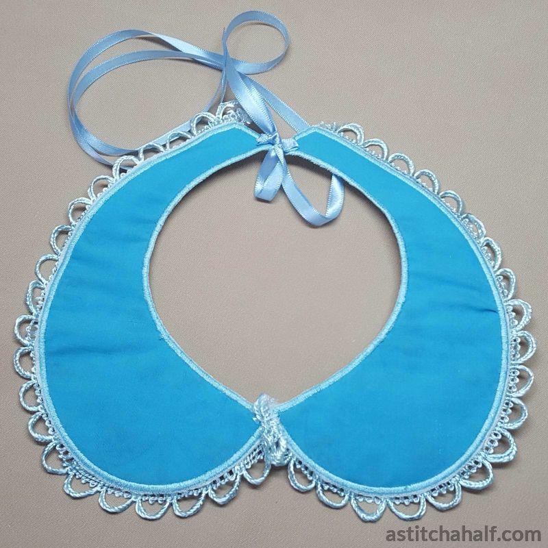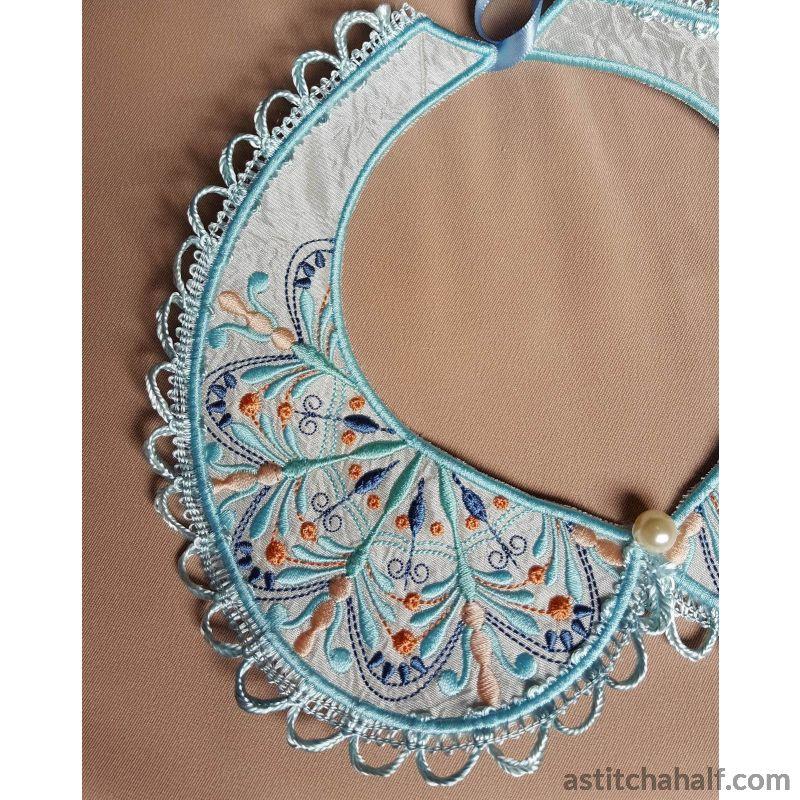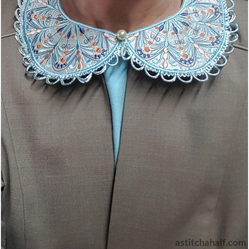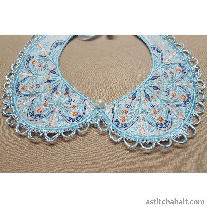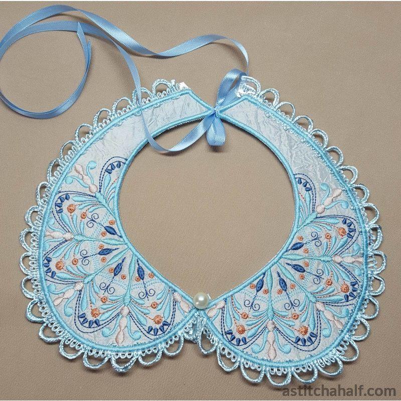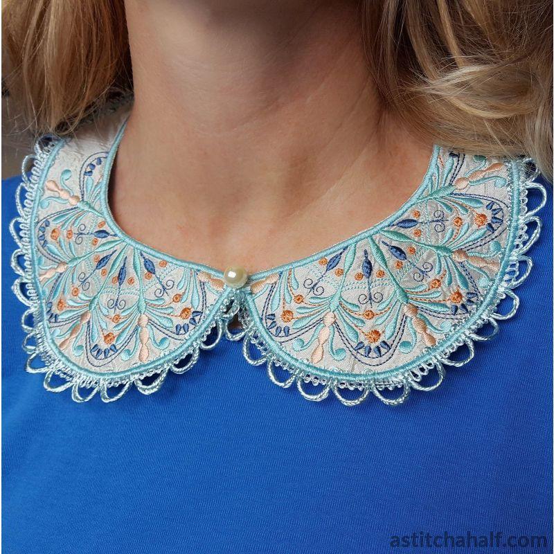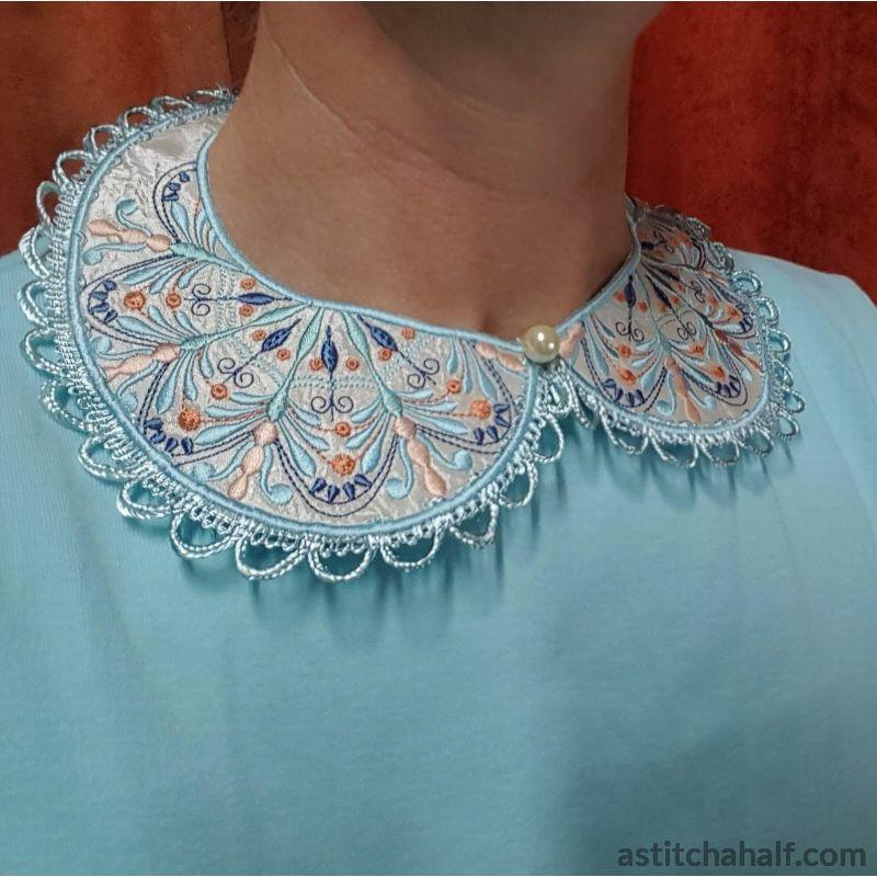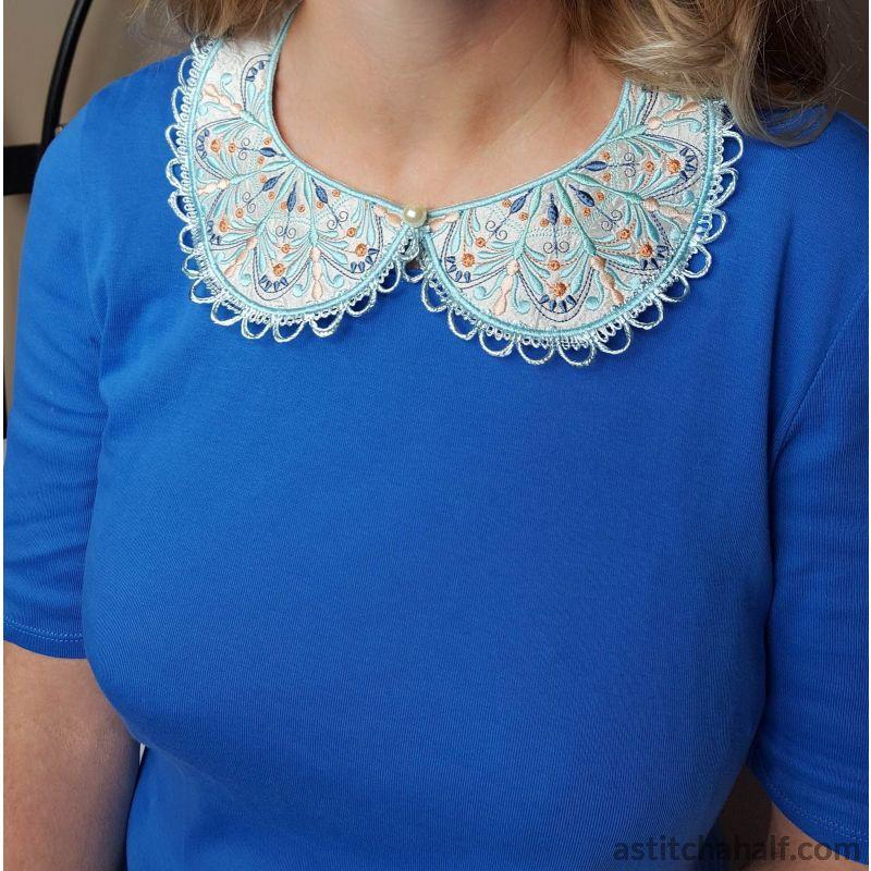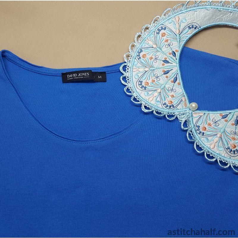 Turn an ordinary blouse or T-Shirt into a show stopper outfit with these detachable Snow Song Peter Pan Collar. One collar fits in one hooping so you simply need to stitch out 1 x left and 1 x right and you have a complete Collar set.