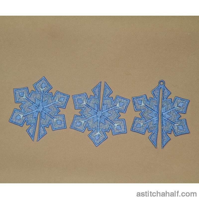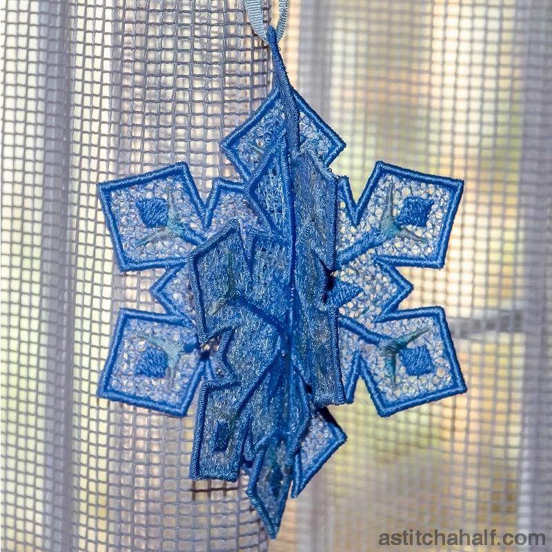 The Snowflake Graupel is unique in the sense that we created a 3D snowflake (freestanding lace) that becomes a decoration to hang anywhere. No matter from which direction you look at it, you shall always see 3 sides of this stunning design.