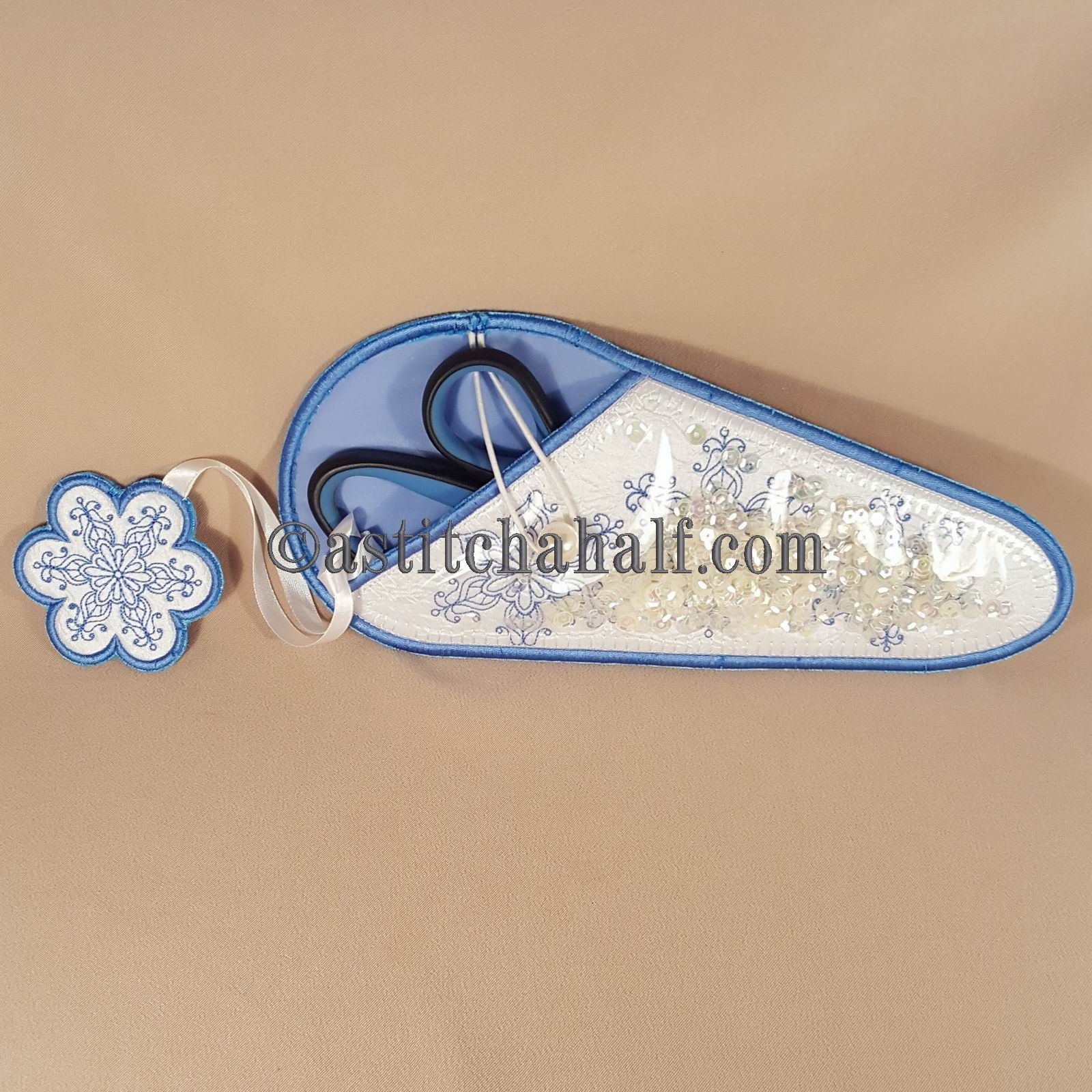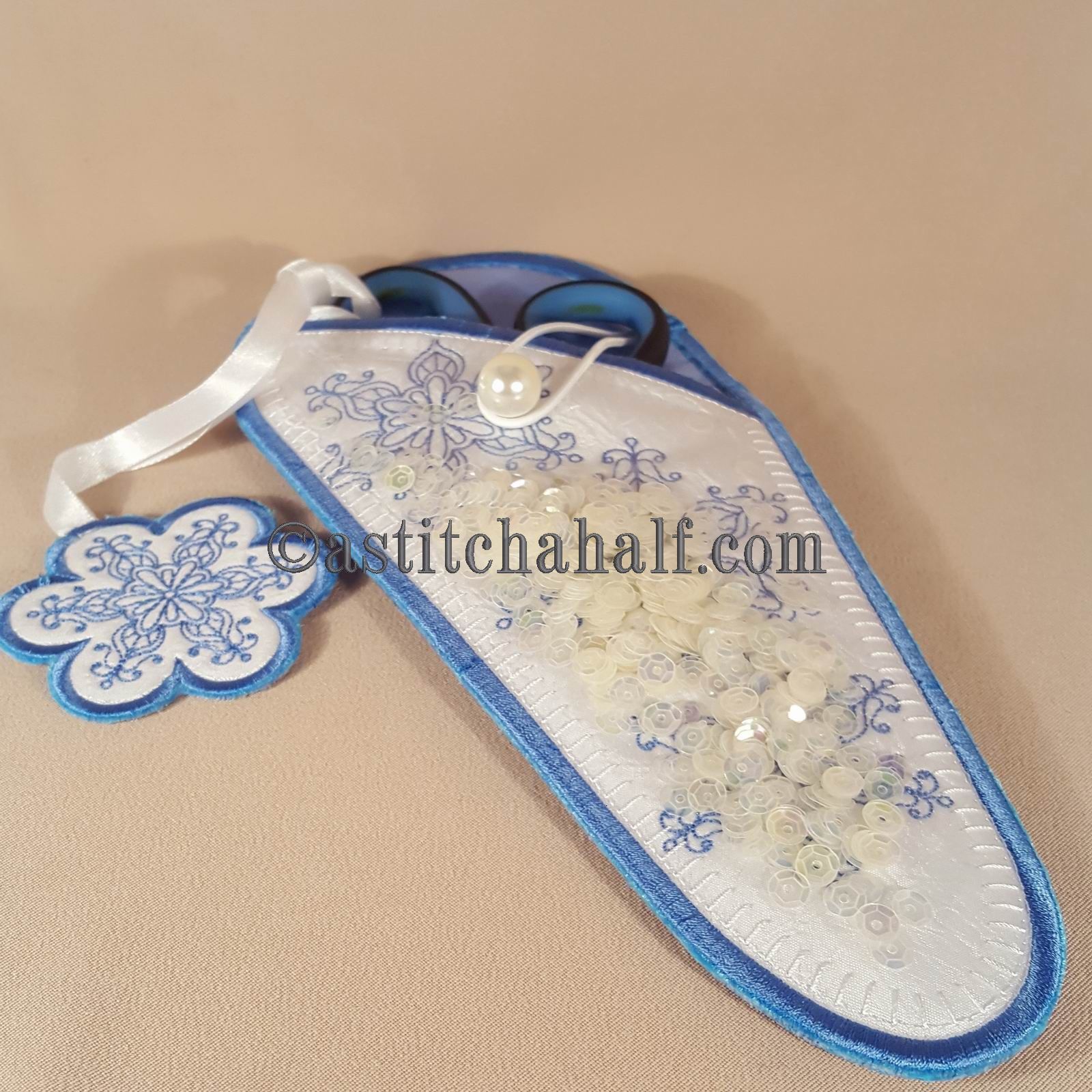 Sparkles Snowflake Scissor Cases with Fob is a great "in-the-hoop" project, a "must have" for every seamstress and embroidery enthusiast! Fits scissors from small to large. Add the matching fob to match your scissors to their Unique Sleeve. The Best Feature is the Sparkles! Your Instant download included a 2 steps easy to follow steps on How To add SPARKLES to this project.