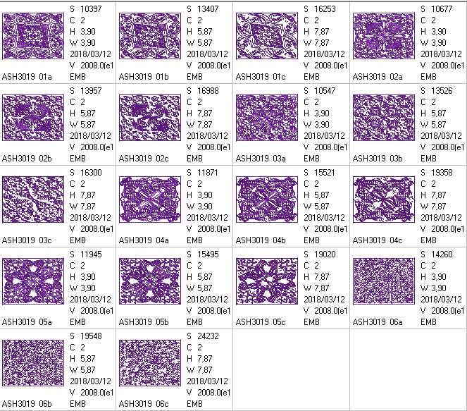 - 8*8 hoop designs x 6 (stitch count = 16,253 - 24,232)