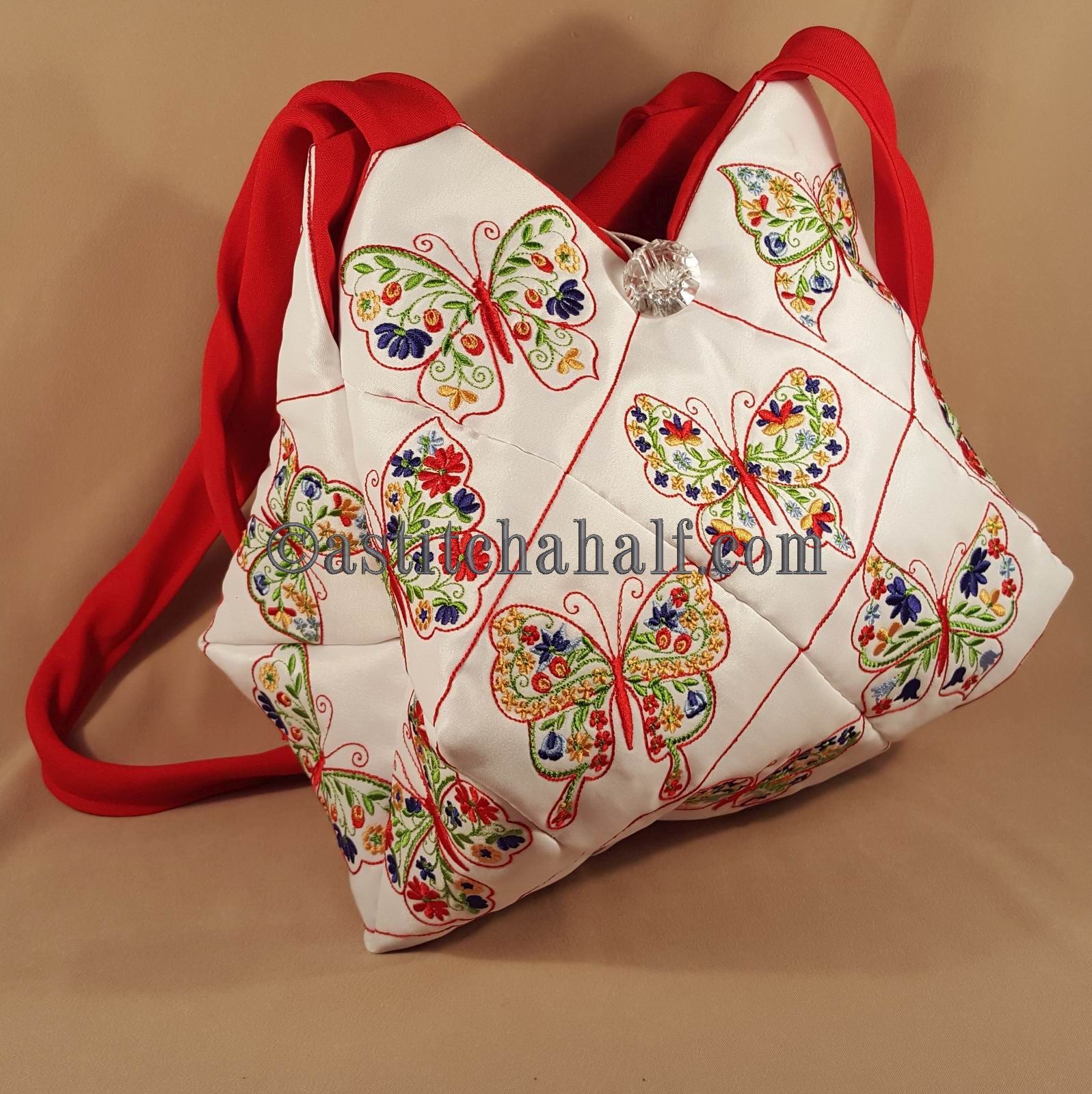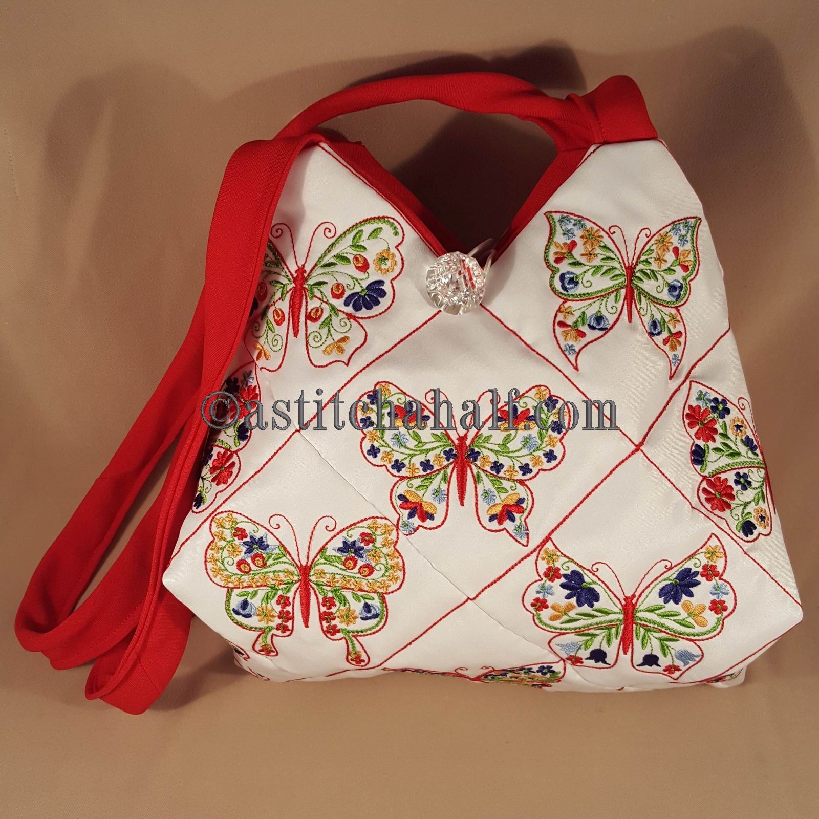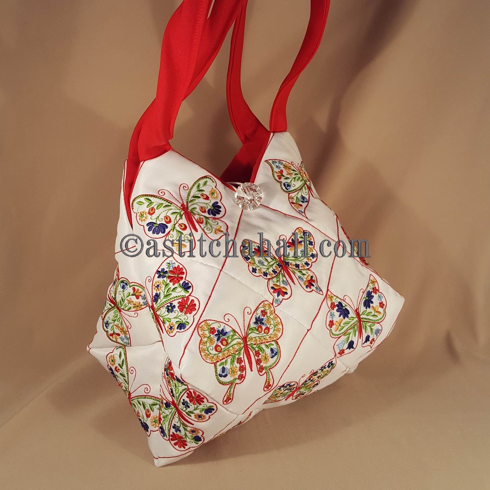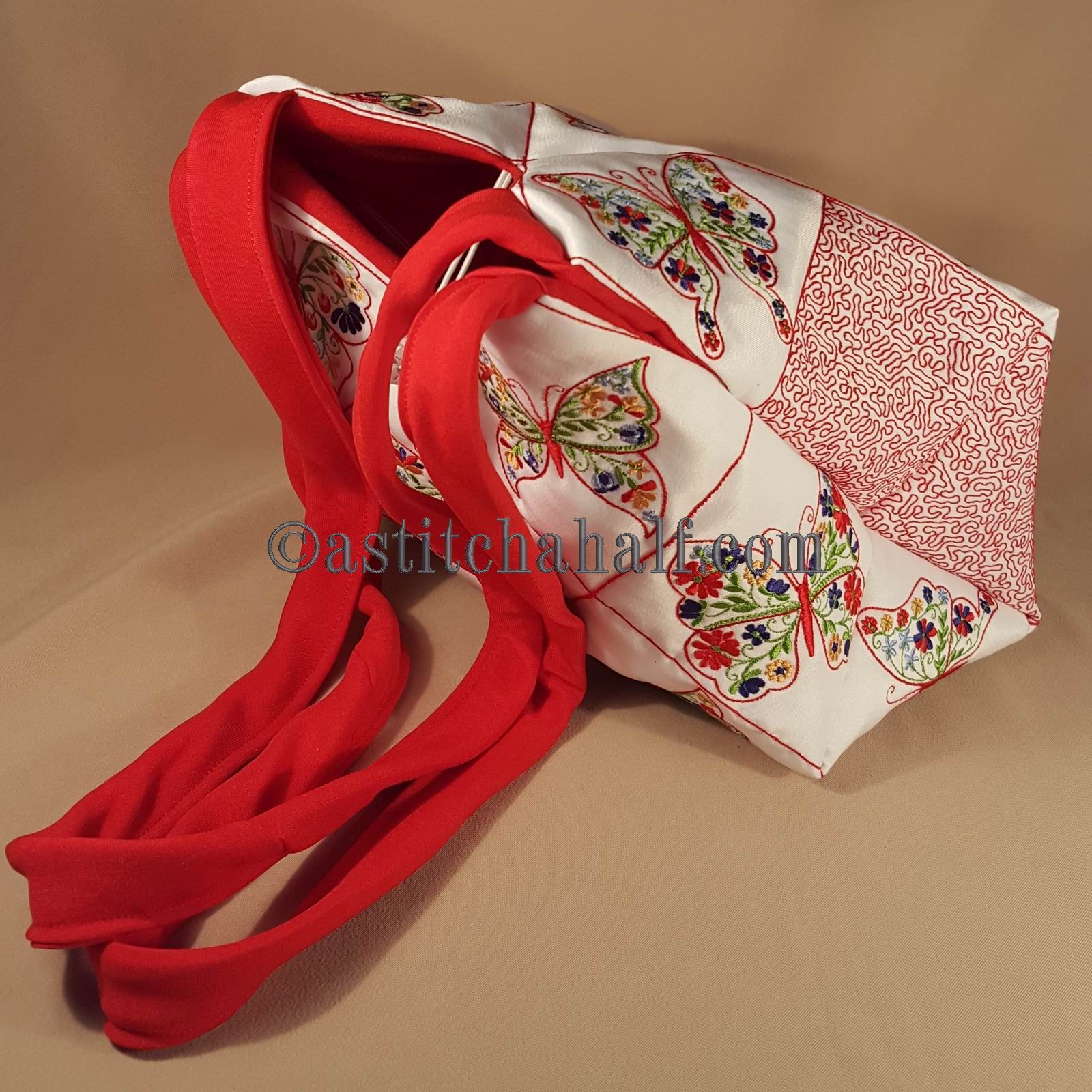 The Tote Bag using 4*4 Hoop designs will measure approx 12" high x 13" wide (a spacious yet elegant size bag)