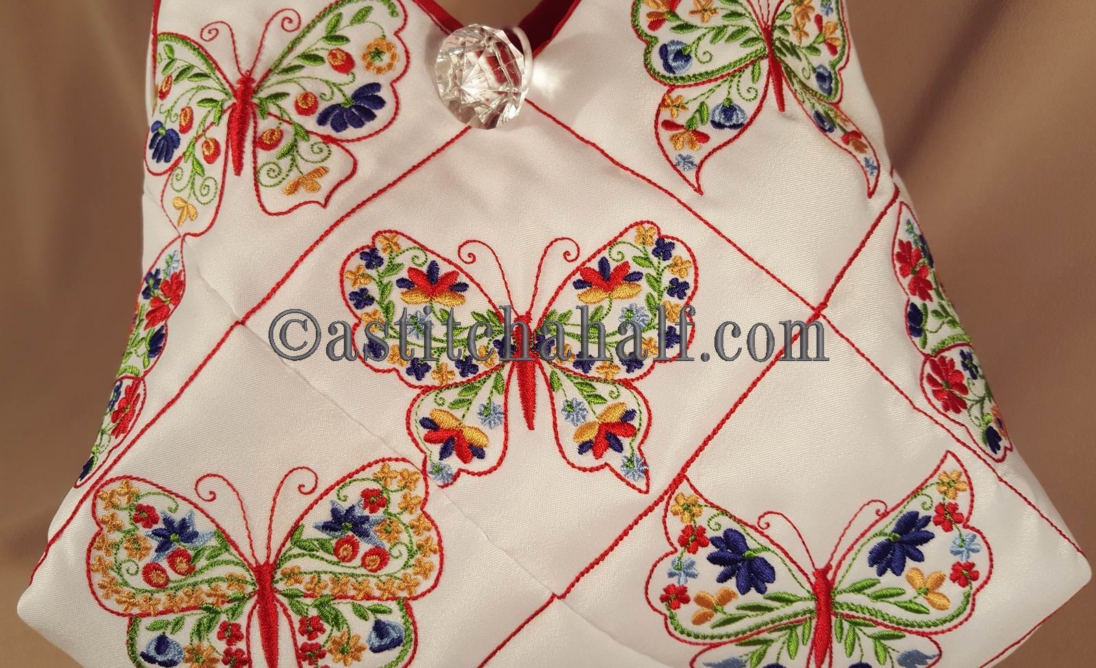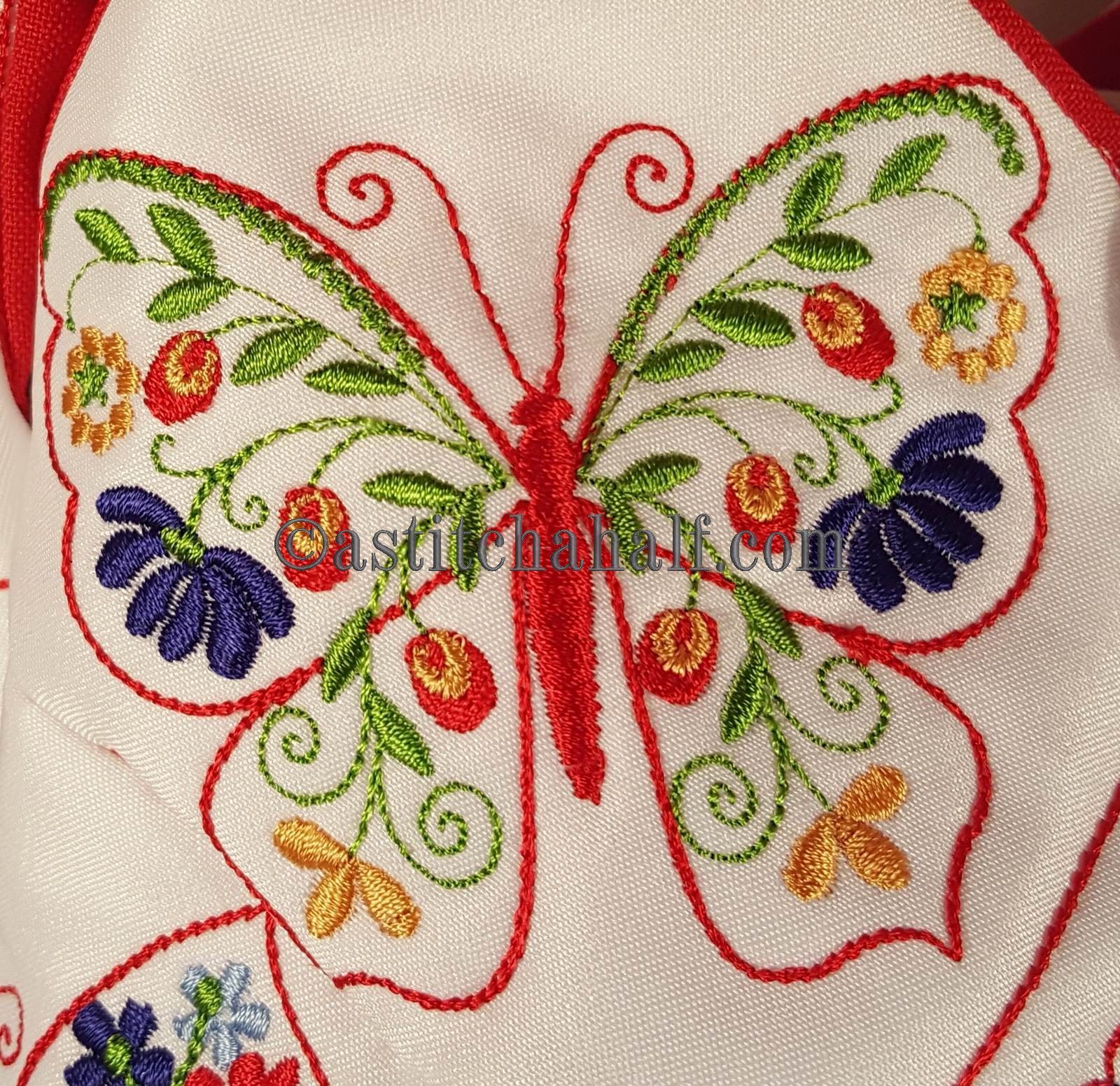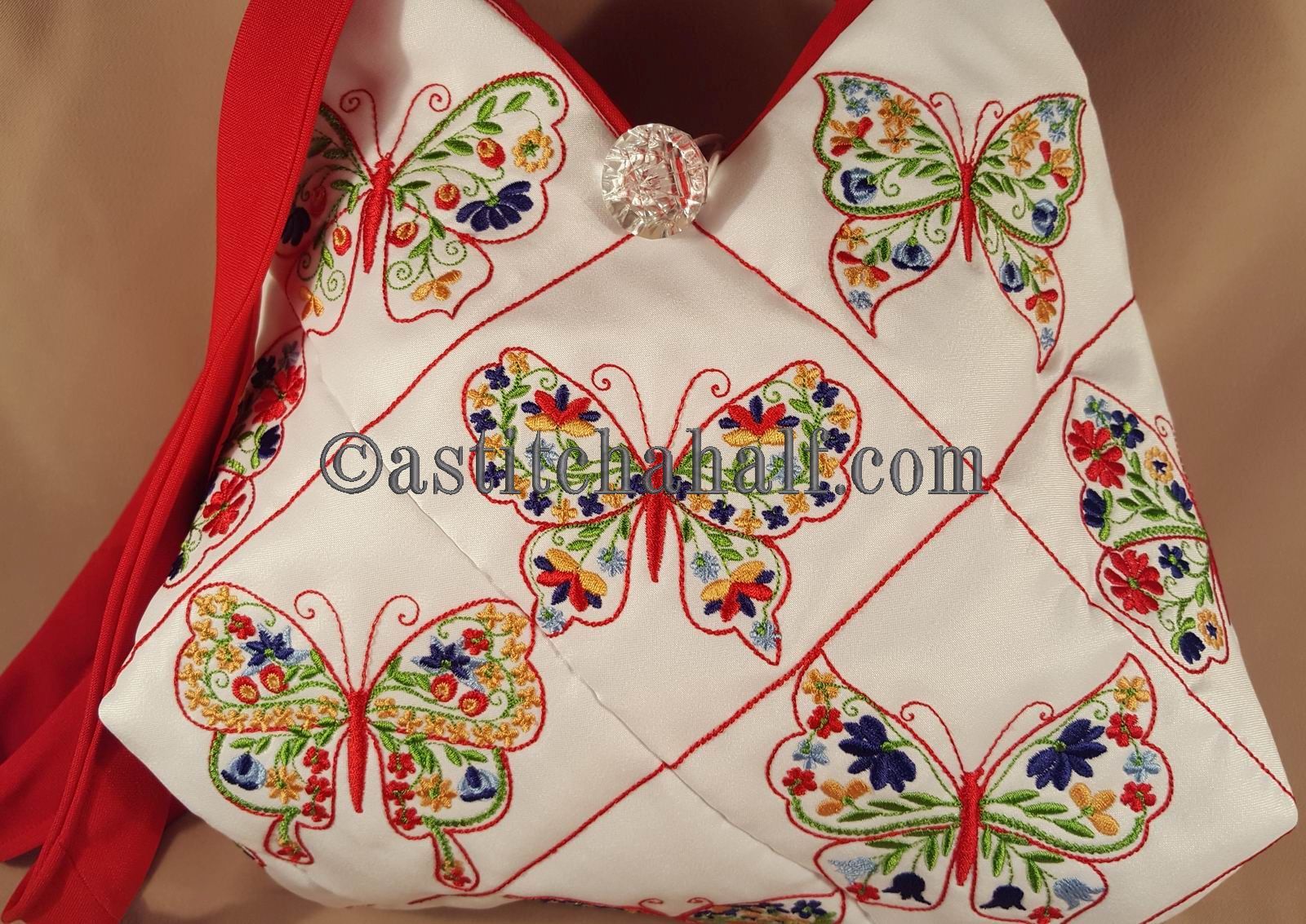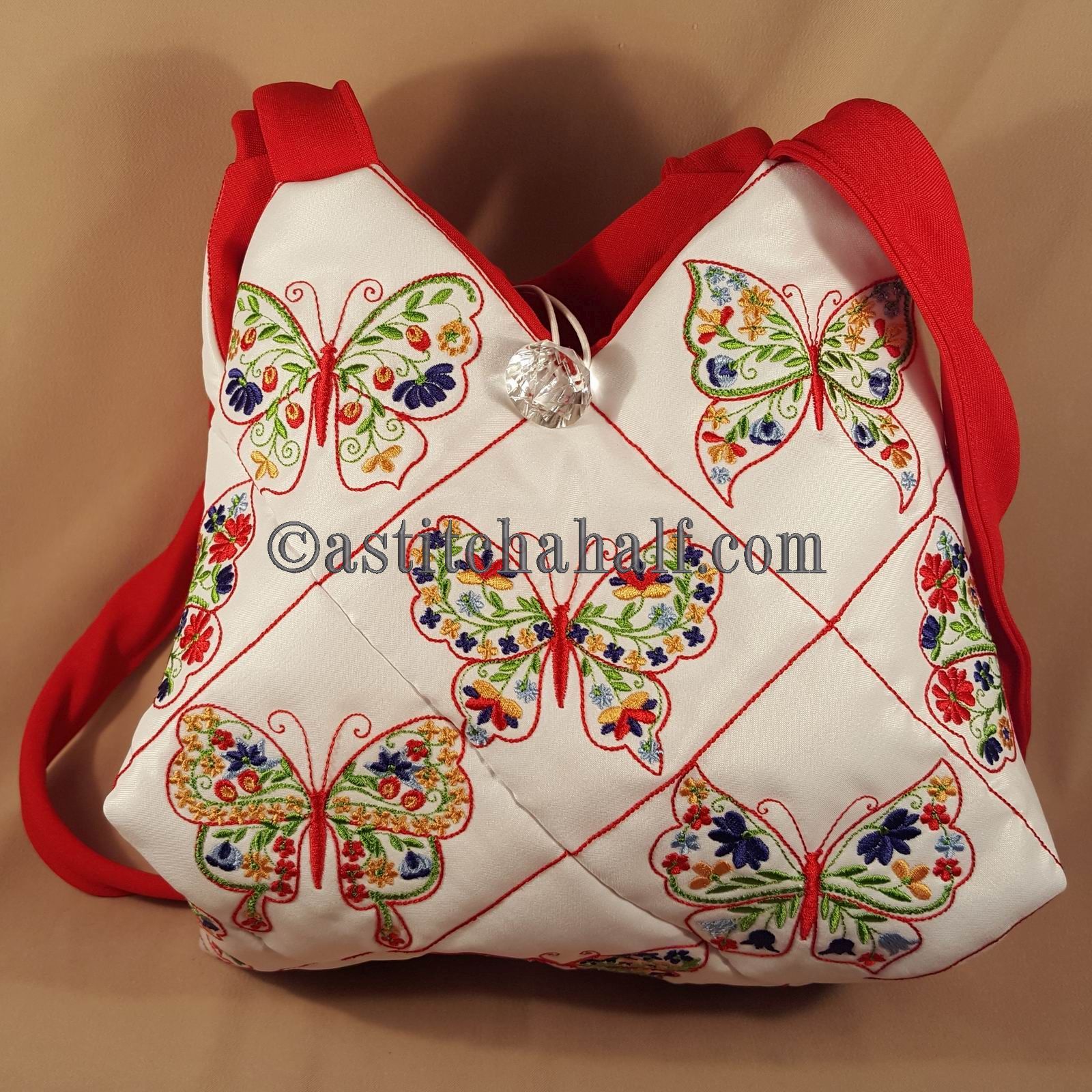 The Tote Bag using 4*4 Hoop designs will measure approx 12" high x 13" wide (a spacious yet elegant size bag)
