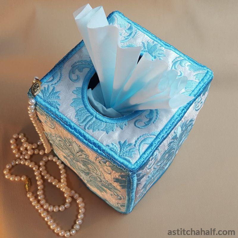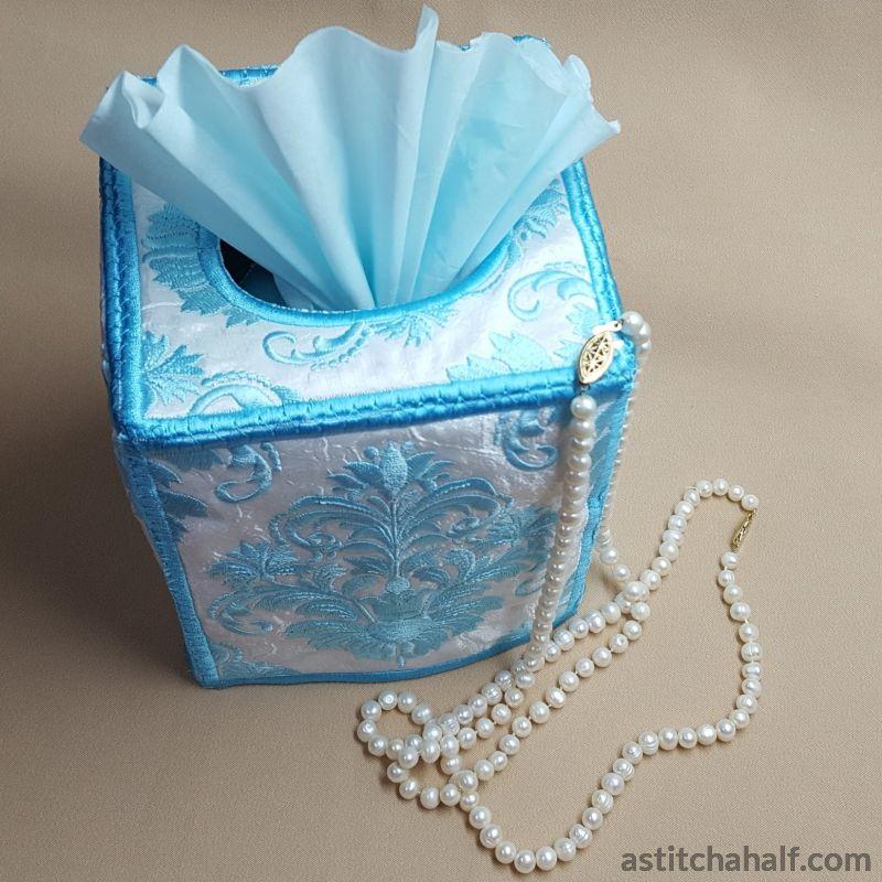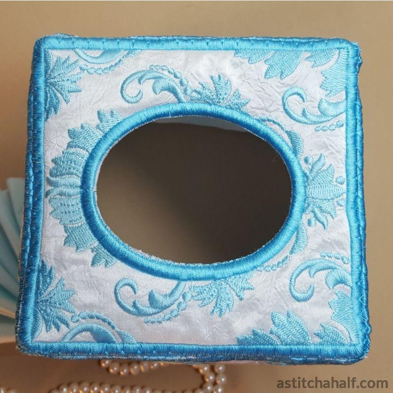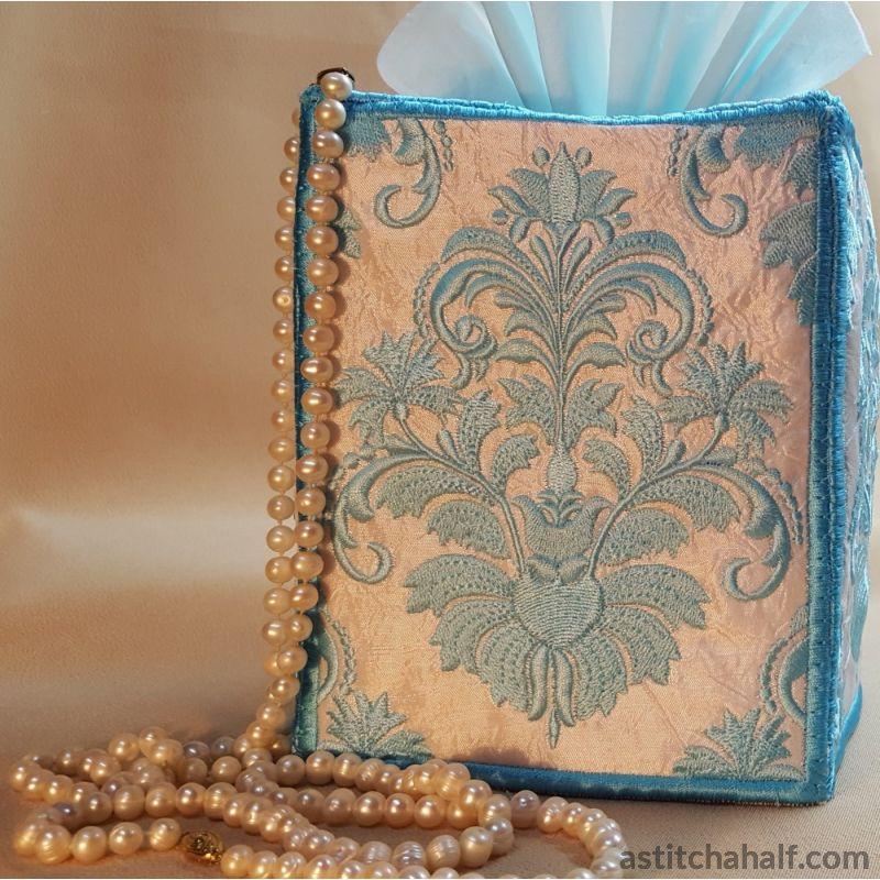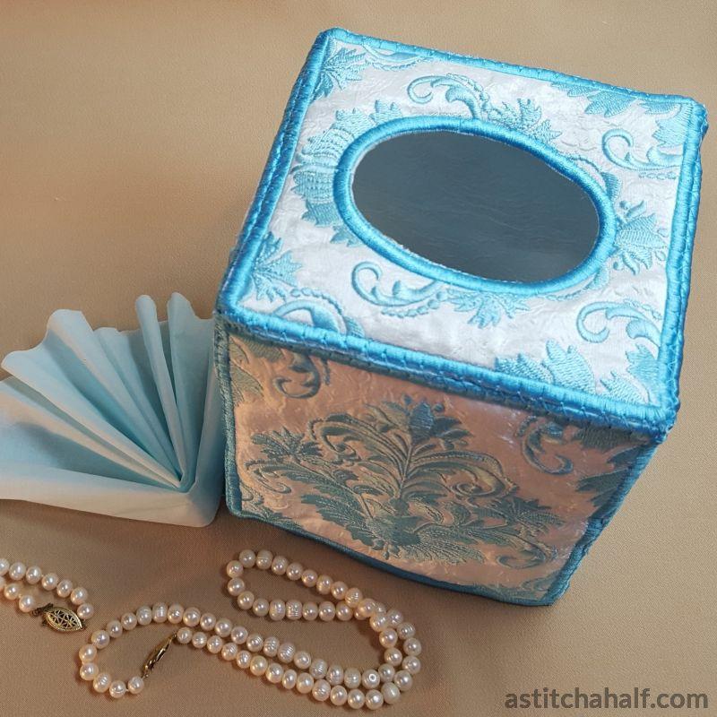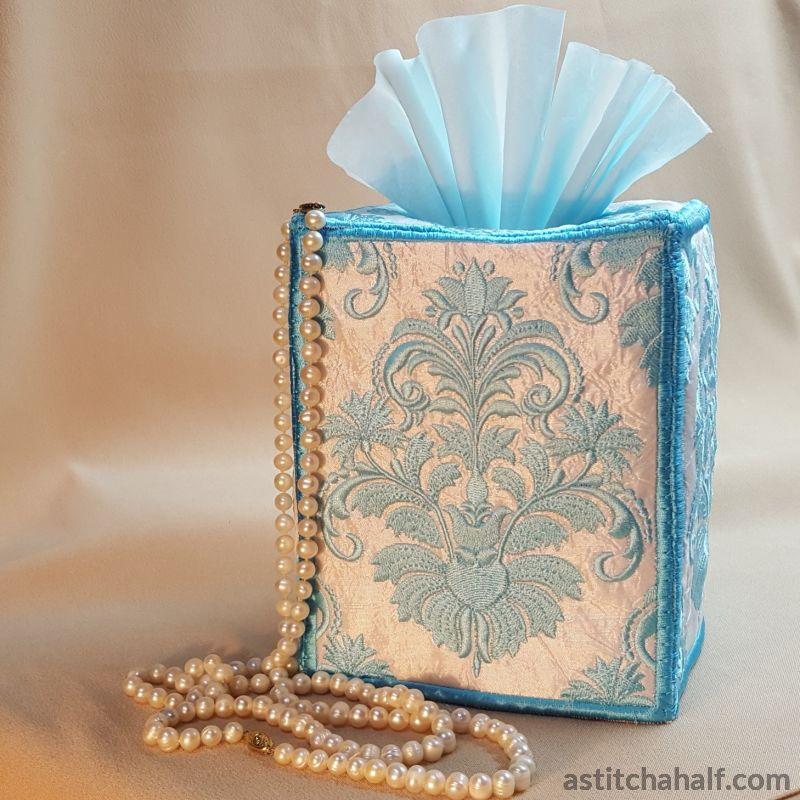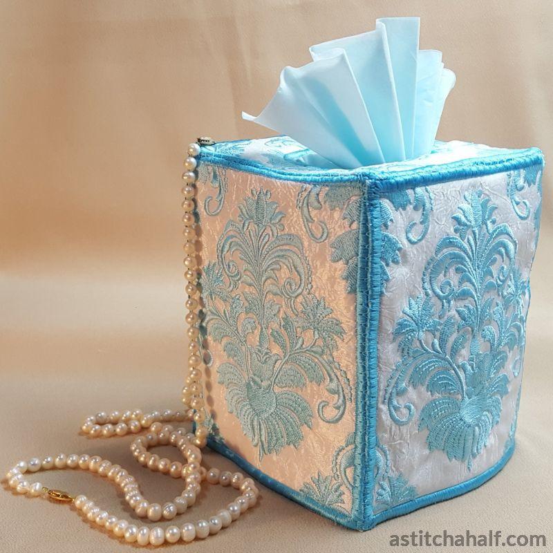 This Tiffany Blue Damask Tissue Box Cover is Square and you receive 2 unique sizes: