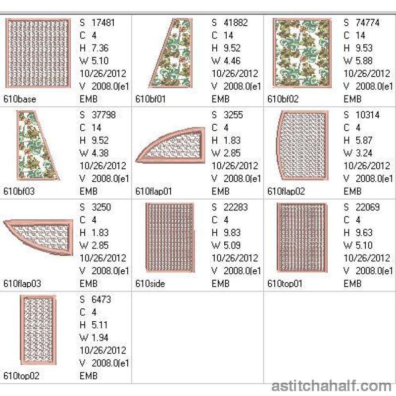 You receive all files for the 6*10 Hoop to complete a Tote Bag