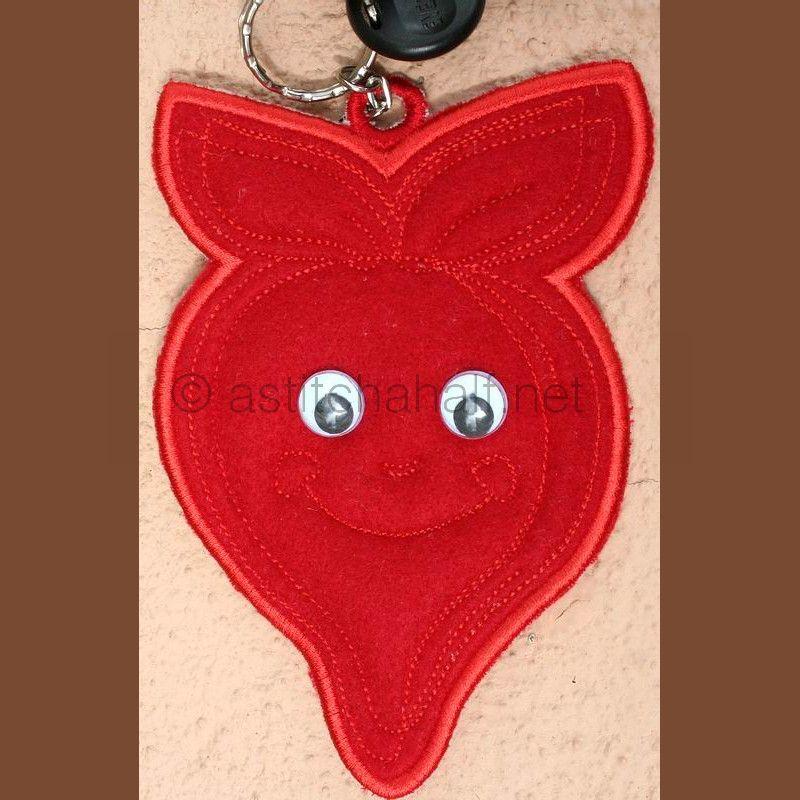 The quick stitch, low stitch count and applique veggy design is an ideal key fob reminder to stay healthy. What a delightfully colorful Radish..
