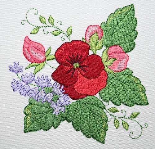 Brighten up a new or used item with this colorful embroidered pansy and rose design. A summer table cloth with matching napkins, even the pockets on a denim or summer`s shirt will look bright and colorful!