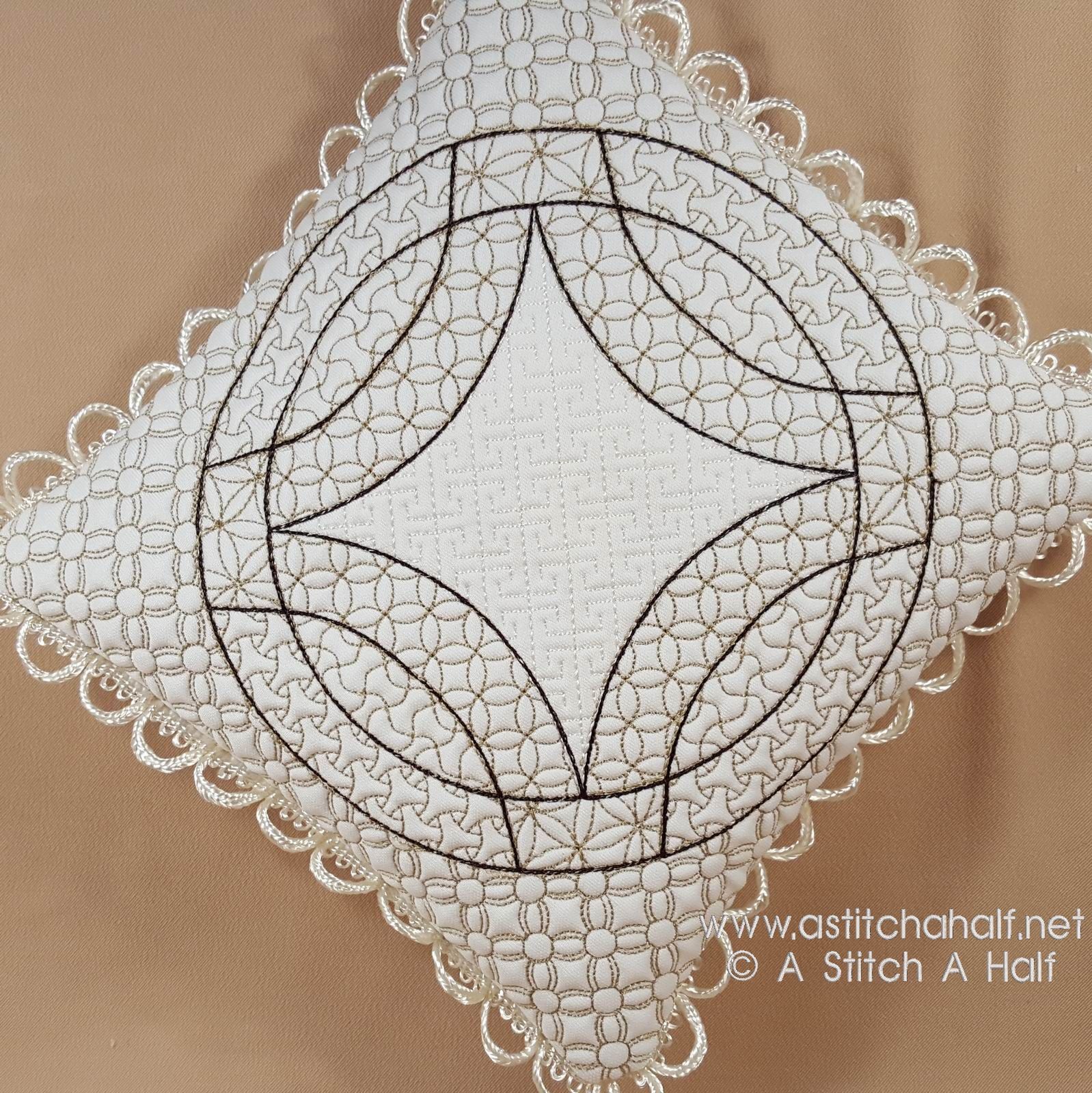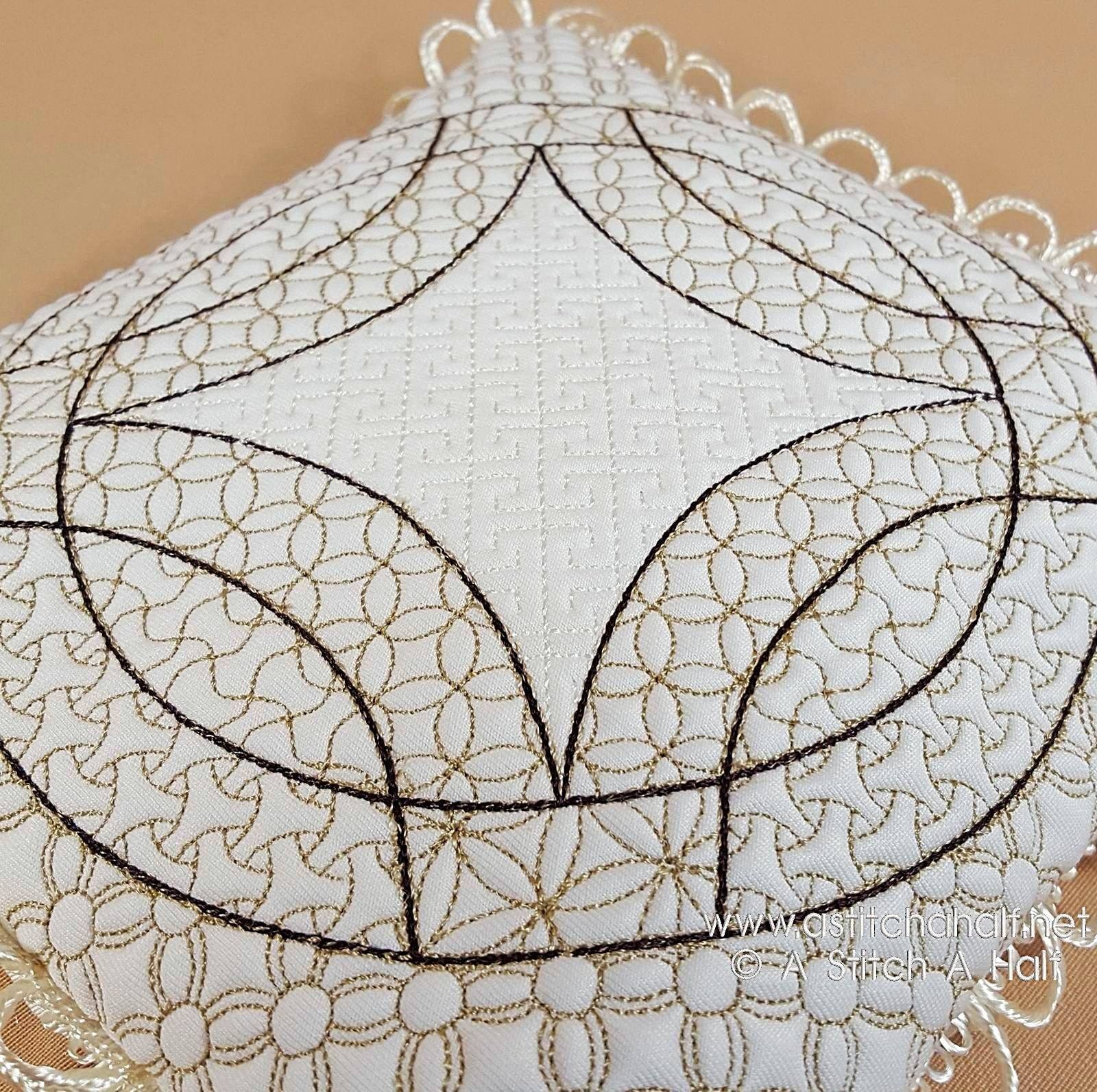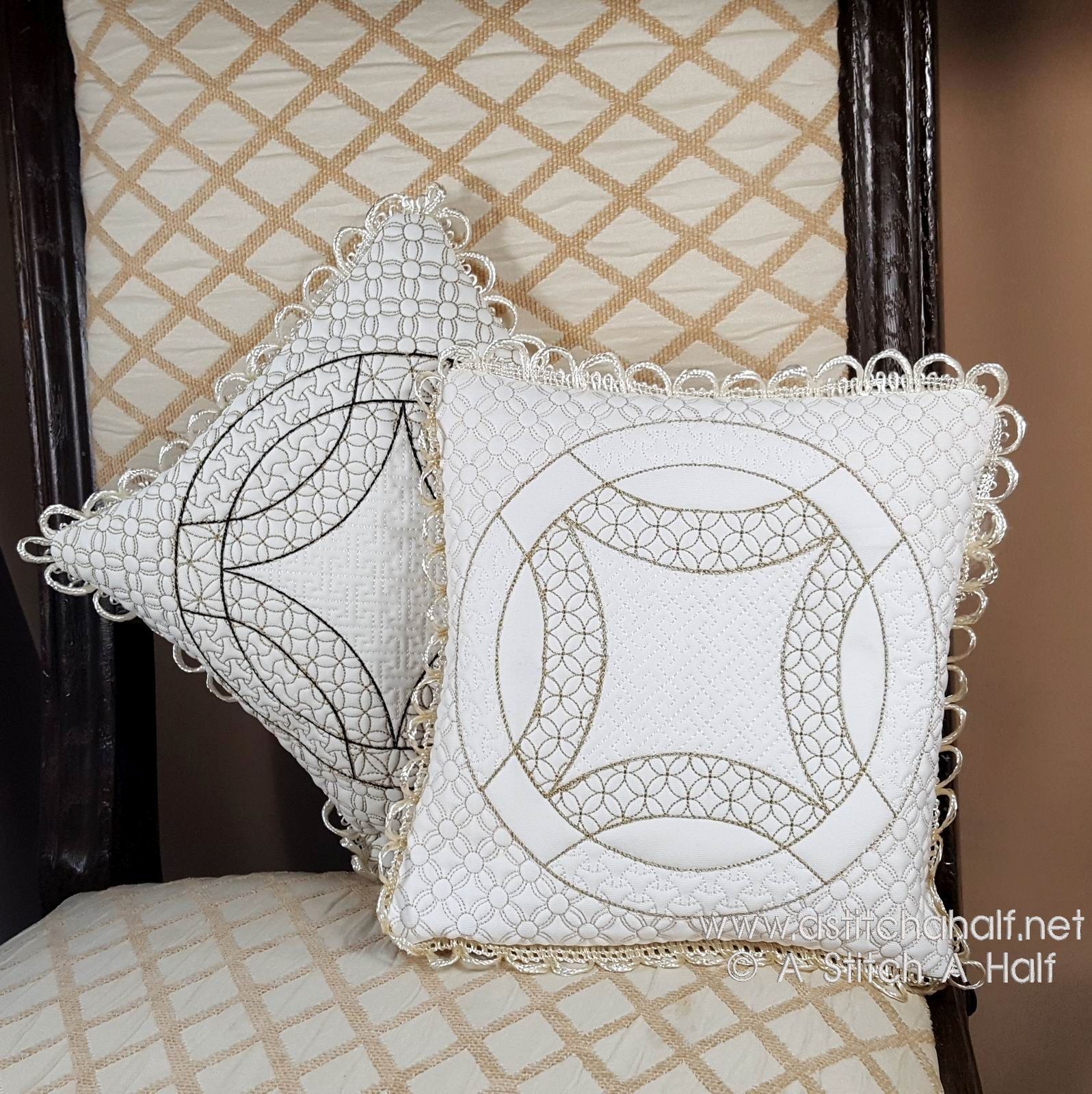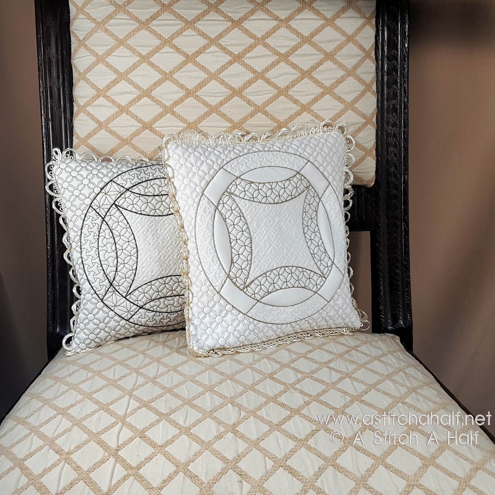 The Wedding Ring Quilt Combo Essentials enables you to embroidery a variety of matching projects with the same theme. These elegant designs are truly timeless, as it can be used to create a complete Quilt, a wedding pillow or variety of matching pillows. Each section features a unique lace pattern.