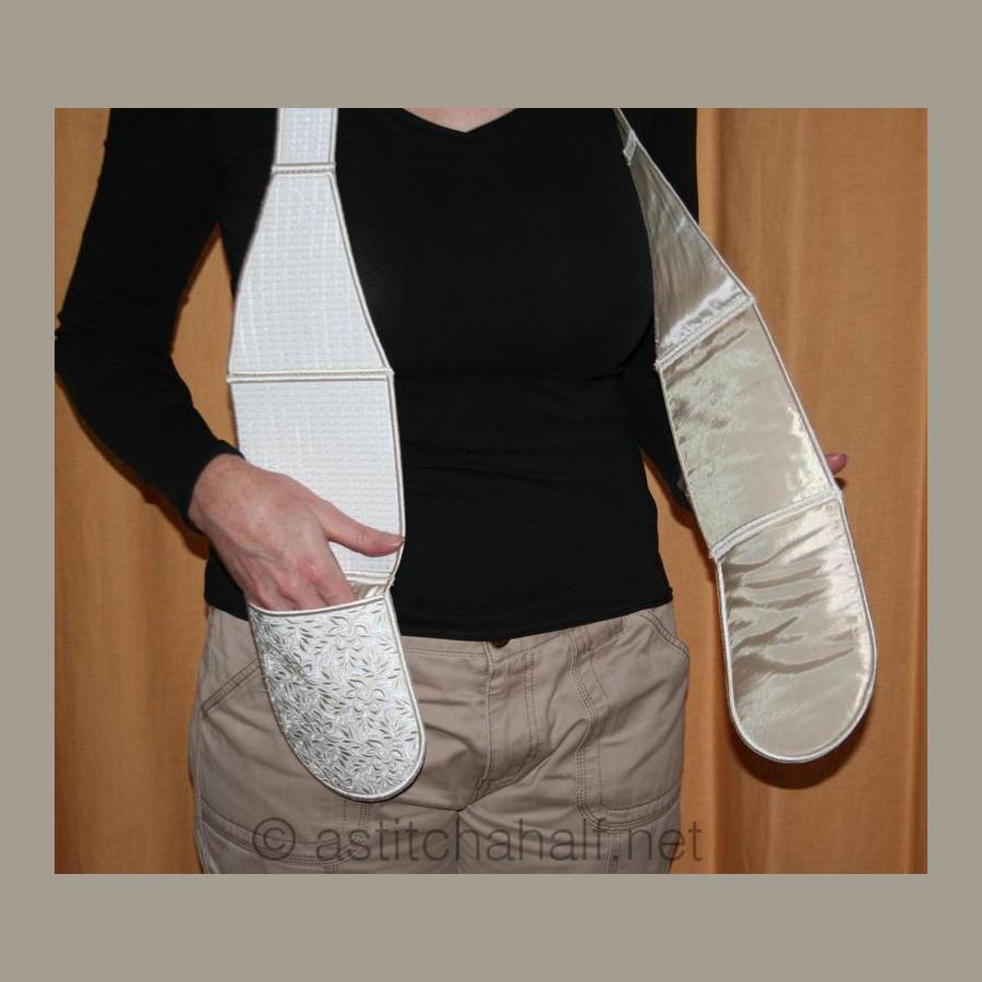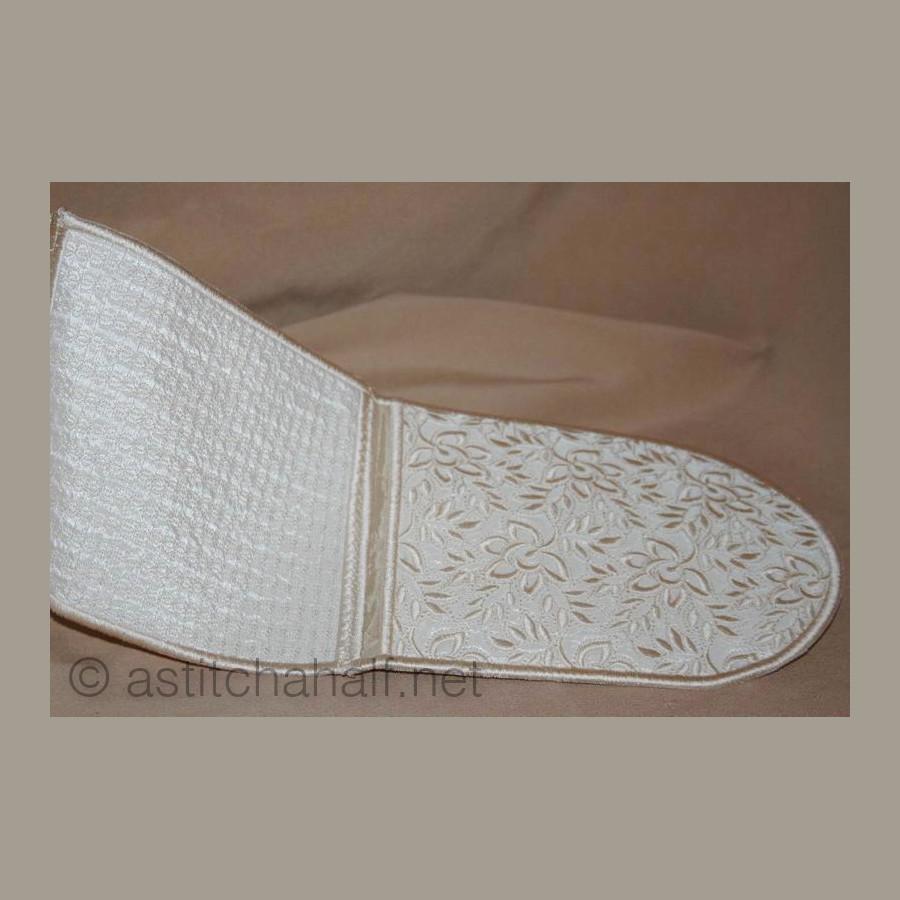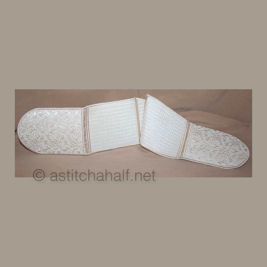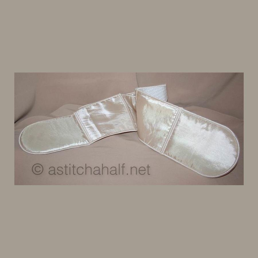 The Whispers in White Pocket Scarf and Mitts can be used for, yip you guessed! You can use it as a set of Oven Mitts or you can use it to drape around your neck like a scarf with handy pockets for you scissors and more. Perfect for the sewing room or the kitchen. You get easy-to-follow instructions included and make your project in 2 sizes.